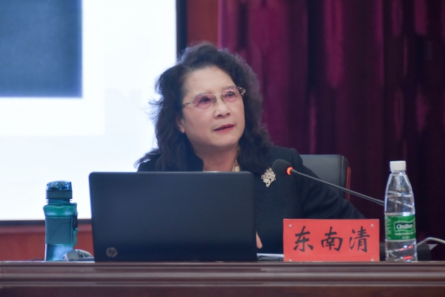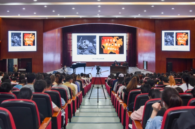 讲座伊始,东南清教授以亲和的语言与现场师生进行互动。通过提问大家对大学生活的满意度、美的认知等问题引发了同学们的思考。谈论到“什么是心中的美”时,东南清教授提出要以“爱国、奋斗、情操和奉献”作为心中的美,倡导同学们要以高昂的精神态度去面对生活。接着,东南清教授从郑州战役、淮海战役、渡江战役和抗美援朝四部分展开了具体讲述。东南清强调,历史是一个国家盛衰兴亡的真实记录,汇聚着一代代先辈们的经验和智慧,作为后代要尊重历史,铭记历史。如何看待历史将决定如何看待当下和未来。