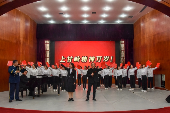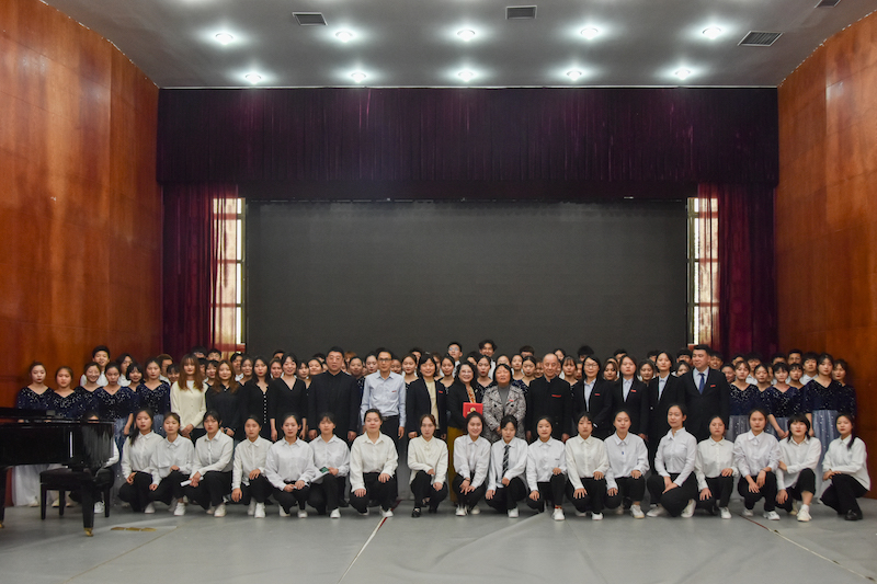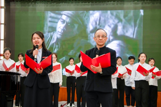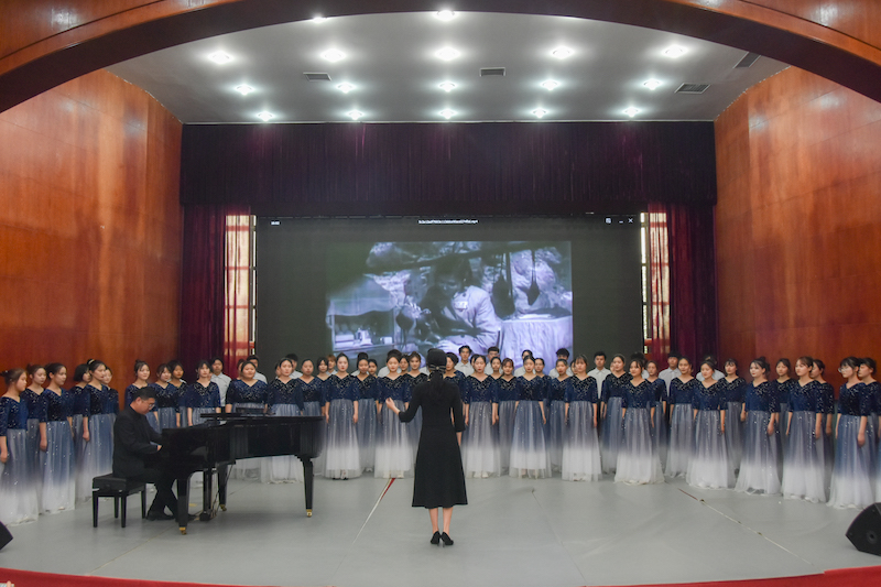 节目表演环节,在老兵艺术团团长贾新平老师电声小提琴和王磊老师钢琴的伴奏下,由孙建国老师和教育学院马贝贝老师领诵,同教育学院的学生们共同带来了诗朗诵《一条大河波浪宽》,慷慨激昂,雄浑有力,多重情绪交错,将现场氛围推向高潮。第二个节目大合唱《我的祖国》由教育学院吕铭聪老师指挥,教育学院学生合唱,用深情的声音倾诉着对祖国母亲的热爱,赢得现场观众的阵阵掌声。