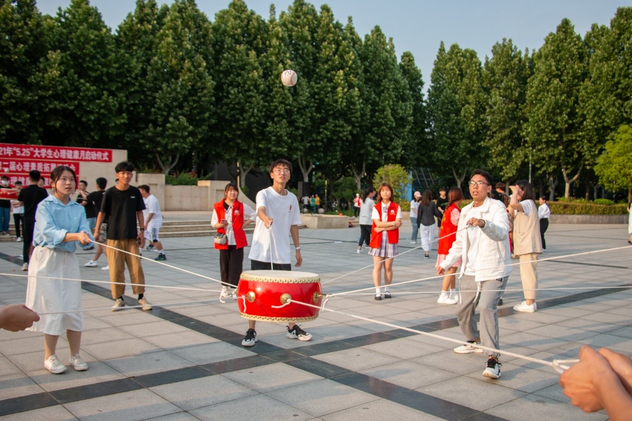 学生参与击鼓颠球游戏