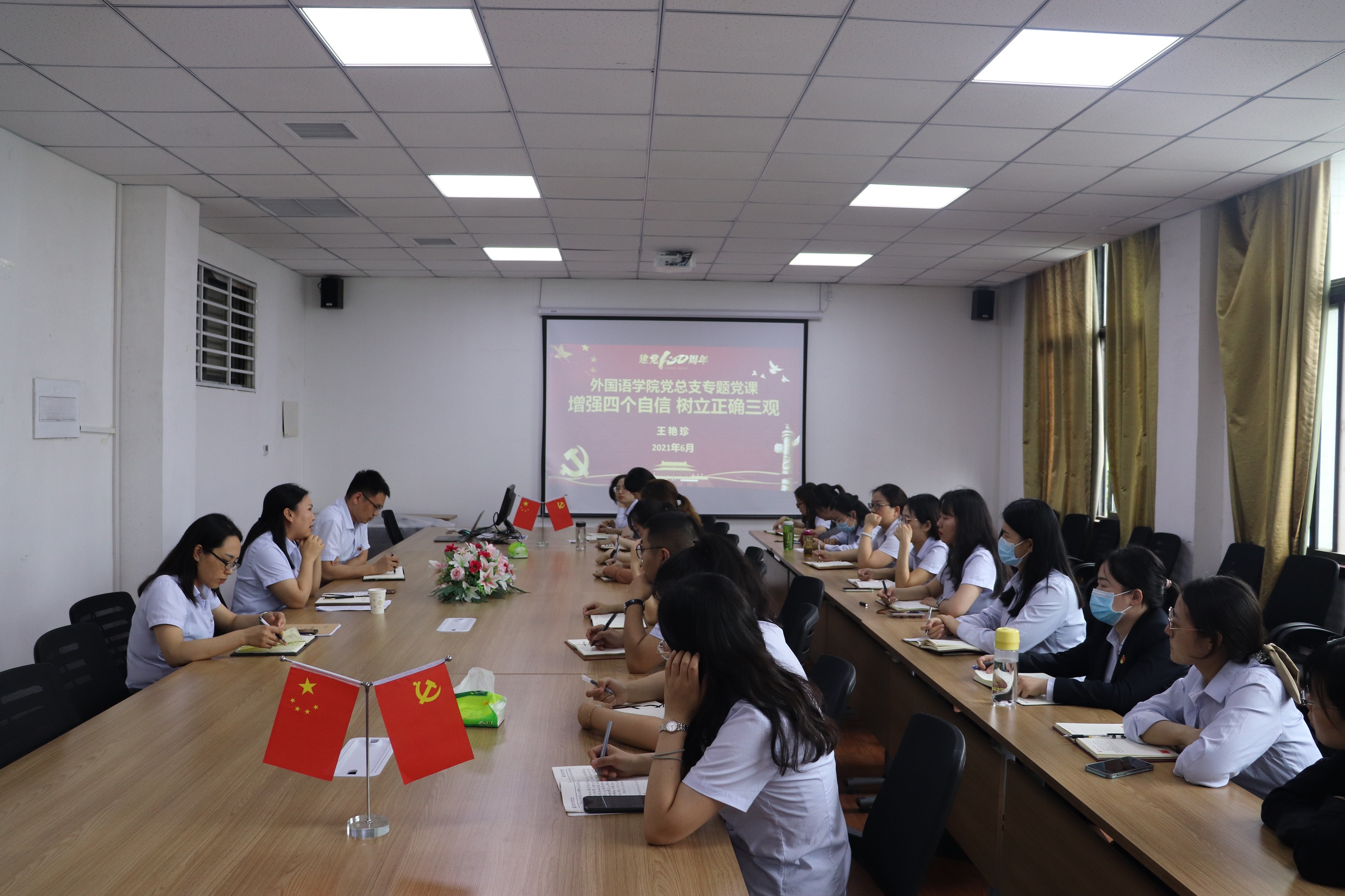 为推进外国语学院党史学习教育,6月17日下午,威廉希尔官网副校长王艳珍以“增强四个自信 树立正确三观”为主题,为外国语学院全体教师党员上了一堂意义深刻、发人深省的专题党课。
