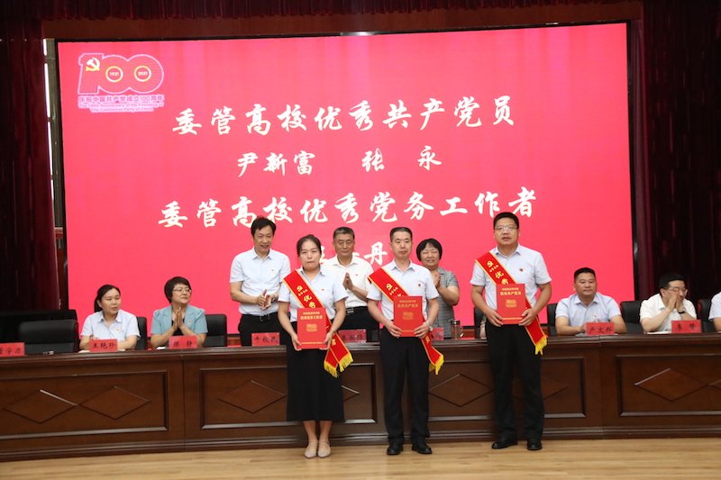 李国强、于向英和牛钦民为受到表彰的“委管高校优秀共产党员”和“委管高校优秀党务工作者”颁奖。尹新富、张永荣获“委管高校优秀共产党员”,王丹丹荣获“委管高校优秀党务工作者”。