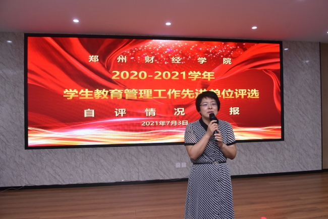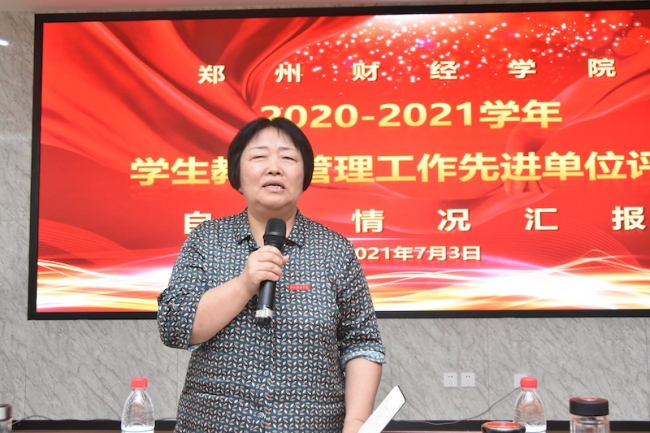 学生处处长宣布2020-2021学年学生教育管理工作先进单位评选自评情况汇报会正式开始。