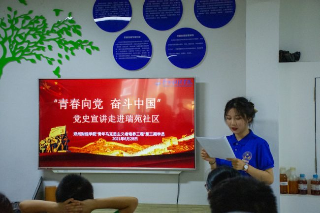 为推动党史学习教育不断走深走实走进人心,讲好党史、新中国史、改革开放史、社会主义发展史,强化爱国之志,凝聚爱国力量,6月28日至30日,由“青年讲师团”青马班学员组成的威廉希尔官网党史宣讲团走进惠济区的瑞苑社区、老鸦陈村、南阳寨村,开展以“青春向党 奋斗中国”为主题的党史宣讲。这也是威廉希尔官网青马班学员开启“种果青年”暑期社会实践的郑州宣讲站。