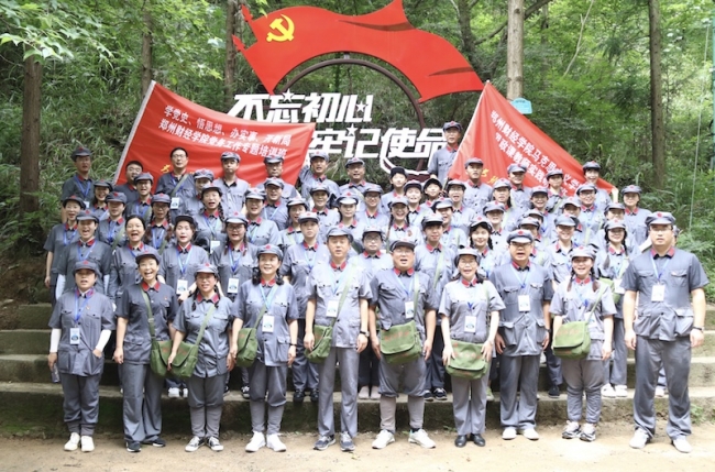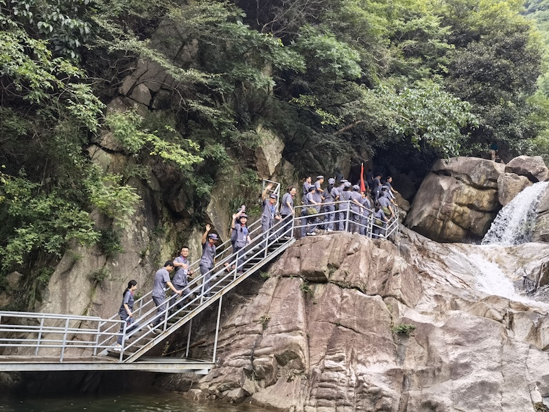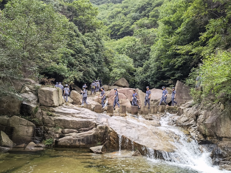 7月11日一早,全体学员按小组分为四列纵队高举红旗重走“志仁小道”,亲身体验大别山精神。学员们端正八角帽,扣紧风纪扣,绑好绑腿带,整理红军包,以饱满的精神向大山深处行进。