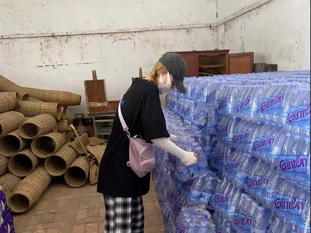 尹思维同学在安置点搬运救灾物资