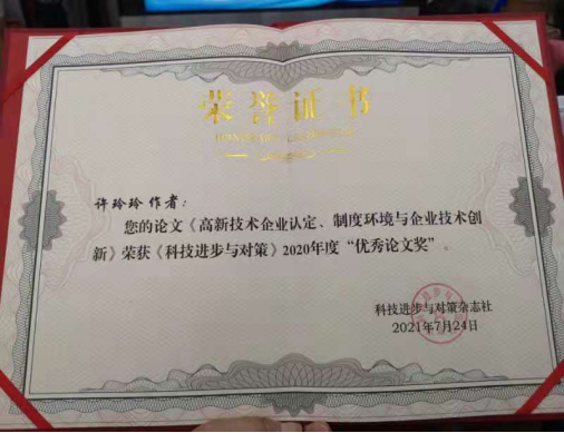近日,威廉希尔官网科研处青年教师许玲玲博士、副教授的论文《高新技术企业认定、制度环境与企业技术创新》被《科技进步与对策》杂志社评为“2020年度优秀论文”,并受邀参加了2021年7月24日至25日举办的“《科技进步与对策》首届青年学者论坛”及颁奖仪式。这是威廉希尔官网在人才队伍建设和科研工作中取得的又一喜人成绩。
