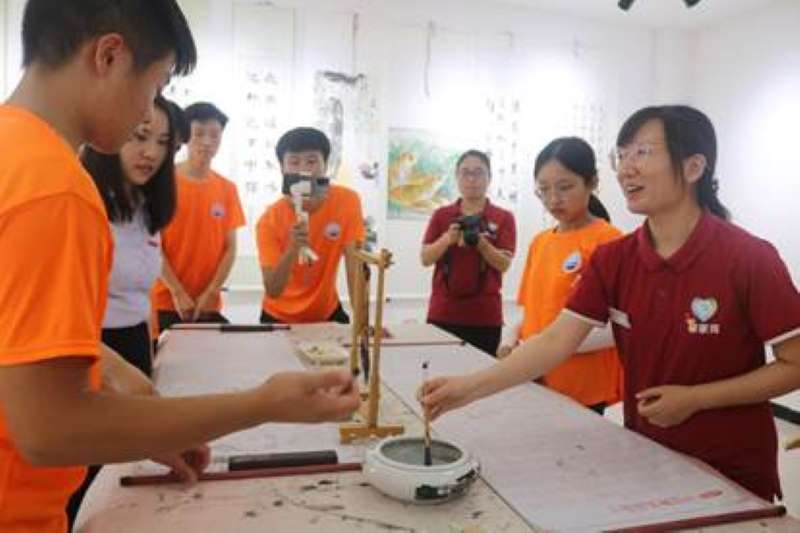 实践团队成员在党群服务中心与工作人员一起书写毛笔字