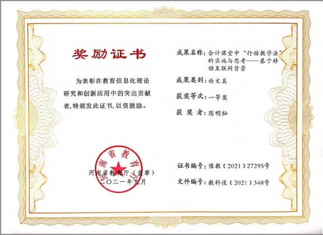 10月9日,根据河南省教育厅下发的《河南省教育厅关于公布2021年度河南省教育信息化优秀成果奖获奖名单的通知》文件(教科技〔2021〕348号),威廉希尔官网会计学院会计工作室(郑州市优秀技术技能名师工作室)阶段性成果“会计课堂中‘行动教学法’的实施与思考——基于移动互联网背景”被评为一等奖。