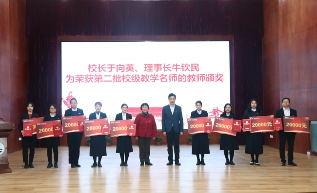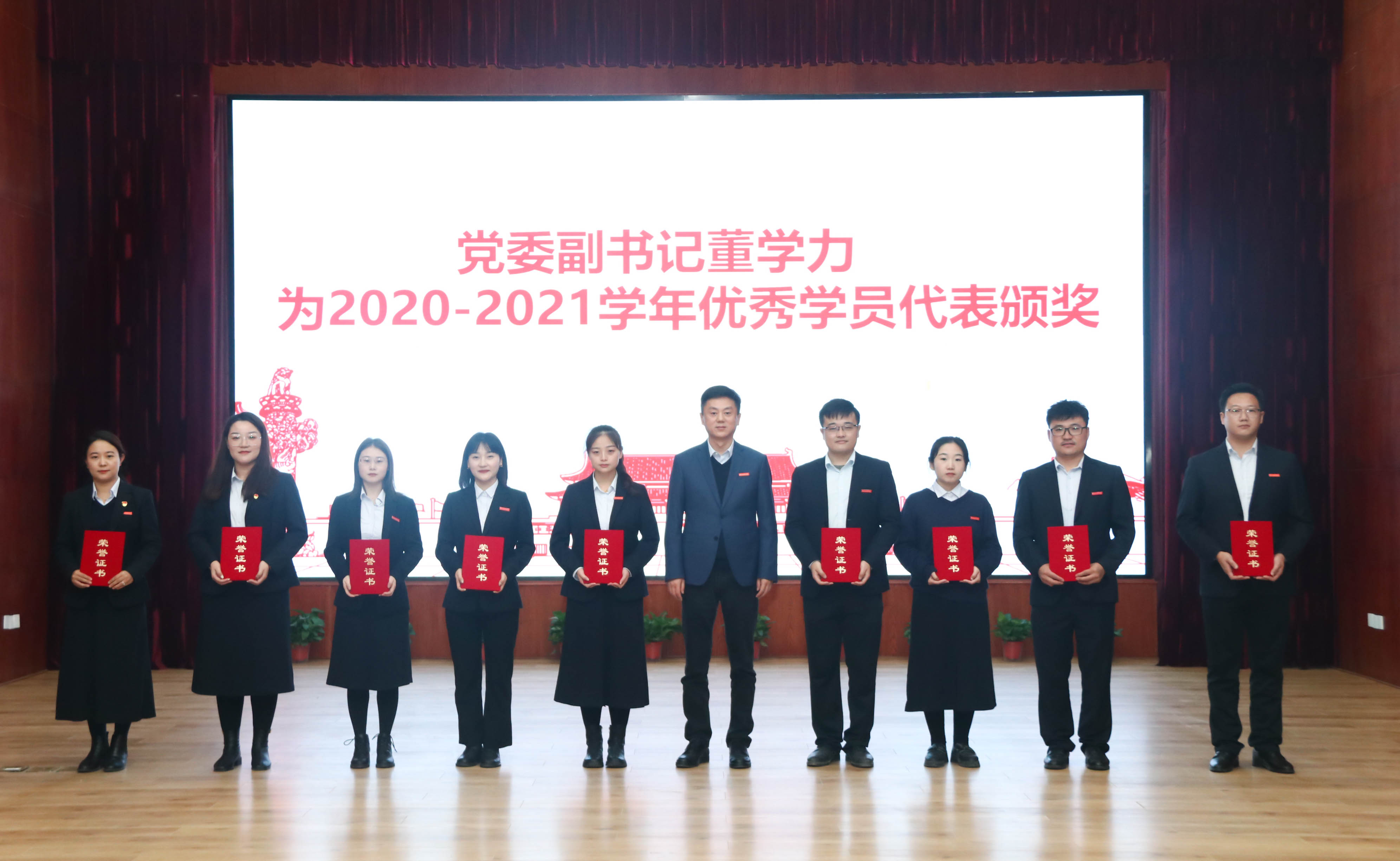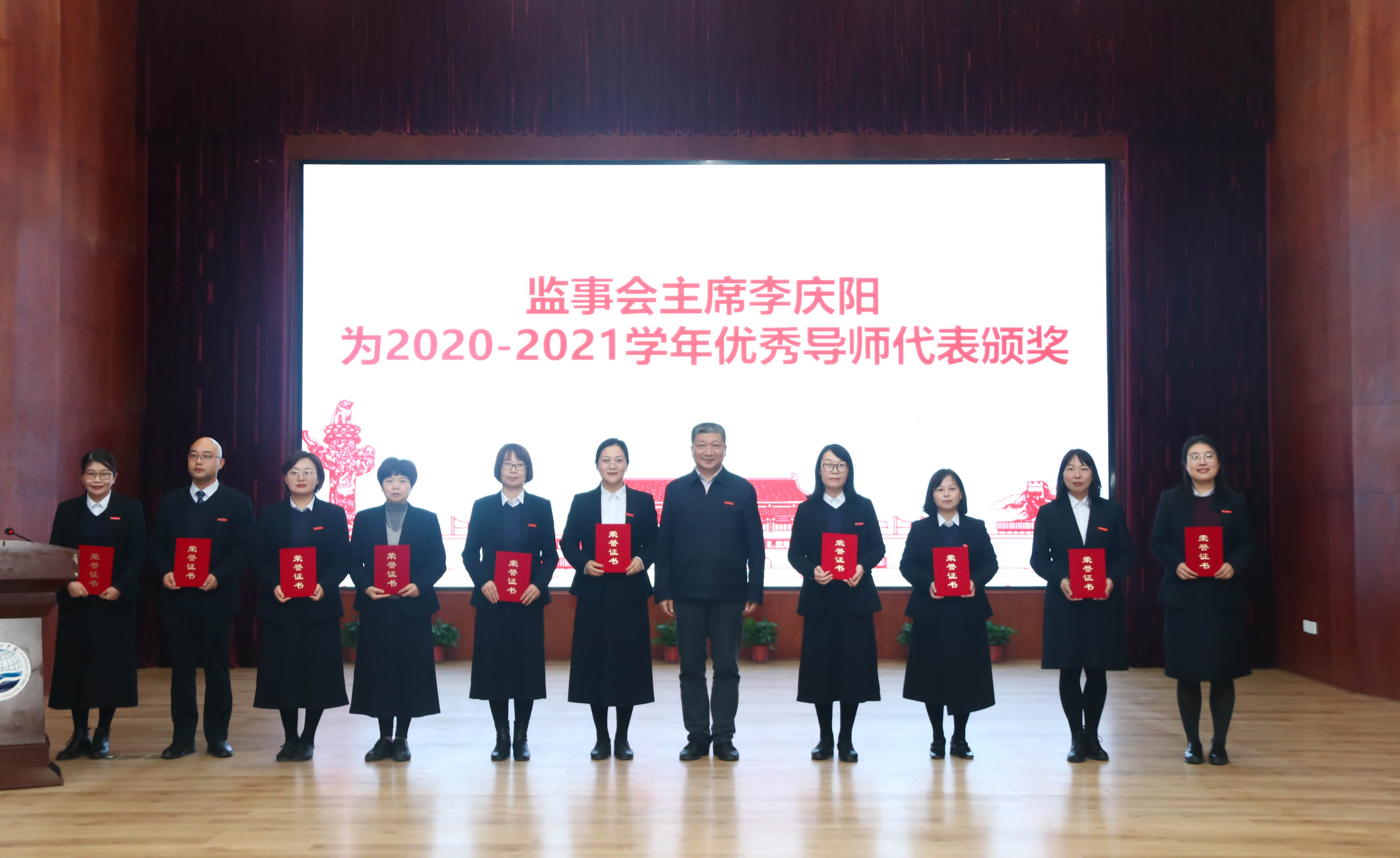 随后,校长于向英、理事长牛钦民为受到表彰的“第二批校级教学名师”颁奖。监事会主席李庆阳为2020-2021学年“优秀导师代表”颁奖。党委副书记董学力为2020-2021学年“优秀学员代表”颁奖。