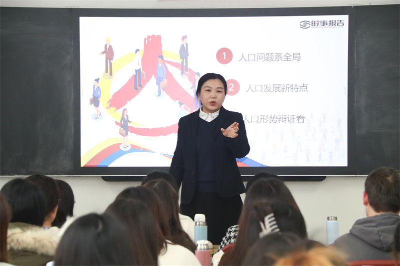 王艳珍以“正确认识我国人口问题”为主题,从“人口问题系全局”“人口发展新特点”“人口形式辩证看”三方面为学生进行了深刻且透彻的讲解。