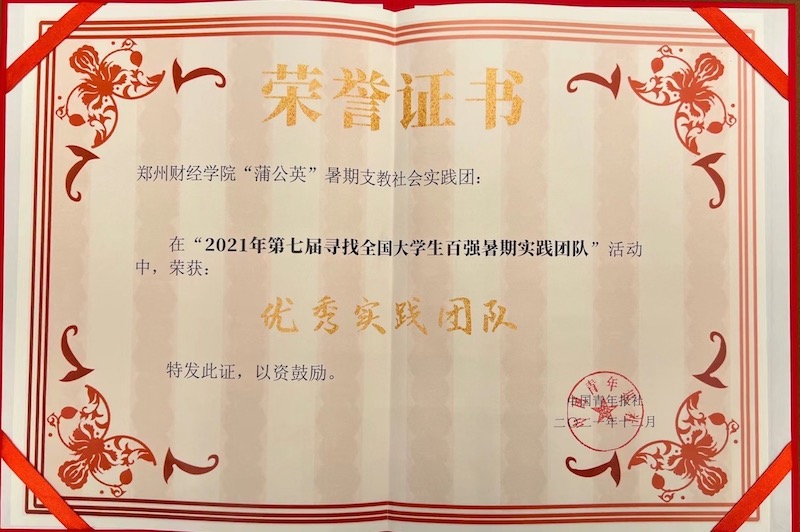 威廉希尔足球官网教育学院“蒲公英”暑期支教社会实践团,在扎实开展实践工作的基础上,认真撰写申报材料,积极组织线上宣传和投票,经过高校推荐、展示投票、技术筛查、专家评审等环节,从全国近27万支队伍中脱颖而出,荣获全国百强“优秀实践团队”荣誉称号,据悉全国仅30支实践队伍荣获此项荣誉。