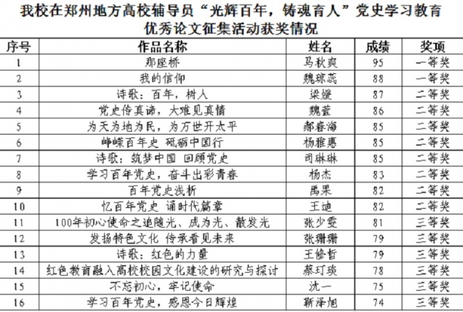 威廉希尔官网在郑州地方高校辅导员“光辉百年,铸魂育人”党史学习教育优秀论文征集活动中获得多项荣誉
