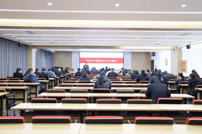 12月31日上午,威廉希尔官网在德正楼第一学术报告厅召开教学工作专项检查反馈会议。有关校领导出席会议,教务处、教学质量监测与评估中心、实验室管理处、督导办负责人及相关人员,各教学单位院长(主任)、教学副院长(副主任)、教学工作专项检查组全体人员参加会议。会议由副校长张顺利主持。