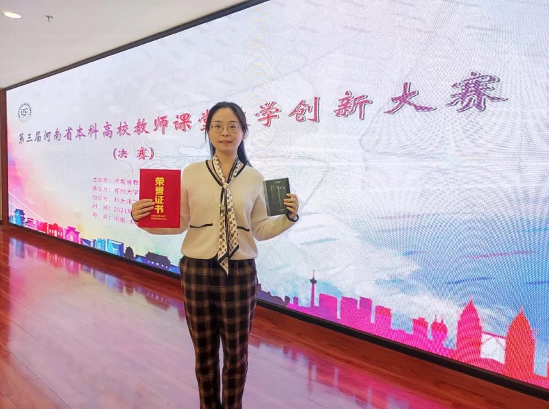 不久前,在2021年第三届河南省本科高校教师课堂教学创新大赛中,王姿力老师经过初赛、复赛、决赛层层选拔,凭借扎实的教学基本功和教学创新设计,荣获青年组一等奖,这是她踏上教学岗位七年来收获的又一份沉甸甸的礼物。