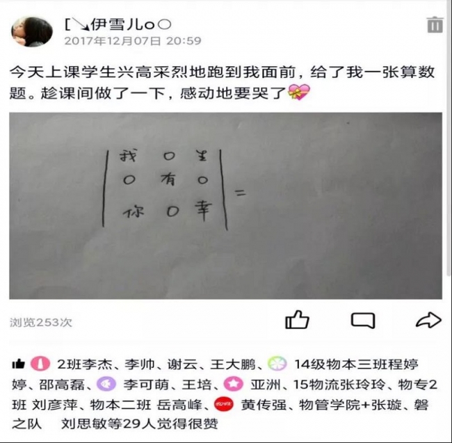 一次课间休息时,王姿力还收到了学生递来的一张小纸条,纸条上是一道特殊的行列式,她试着做了一下,解出来的答案是“我有幸一生有你”。对于当时教龄不长的王姿力来说,这是一种鼓舞和肯定,她还专门发了一条QQ动态,记录身为一名教师的感动与幸福。一张不起眼的小纸条,却承载着学生对老师满满的爱和信任。