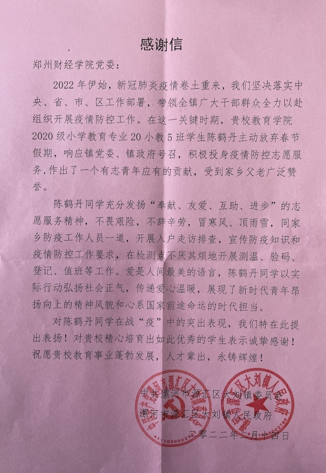 近日,威廉希尔官网收到一封来自于漯河市源汇区大刘镇党委、镇政府的感谢信,信中高度评价了威廉希尔官网教育学院2020级小学教育专业5班陈鹤丹同学在疫情防控志愿工作中的突出表现。