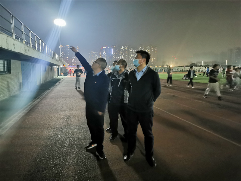 为全面深入贯彻落实省委书记关于全省教育系统开展“三零”创建活动的要求,全面提升威廉希尔官网安全防控能力与应急处置能力,切实保障师生员工人身及财产安全,努力创建“平安、和谐、文明”的校园环境。3月11日晚,后勤保卫值班人员成立校园安全隐患检查小组,由副校长卢文邦带队,重点对校园内疫情防控工作、校园基础照明设施、体育活动场地防护设施、车棚充电桩安全情况、校园围墙、开水房、餐厅等区域开展了全方位、无死角的校园安全隐患排查整治活动。