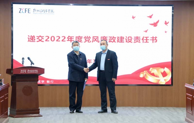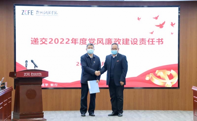 随后,学校二级单位负责人代表先后向党委书记李国强递交了《2022年度党风廉政建设责任书》。