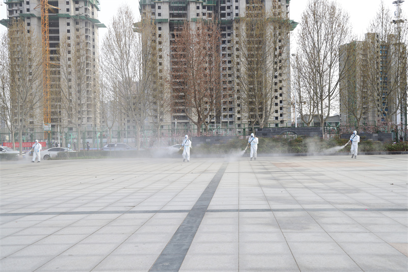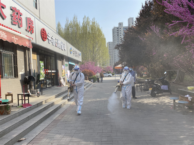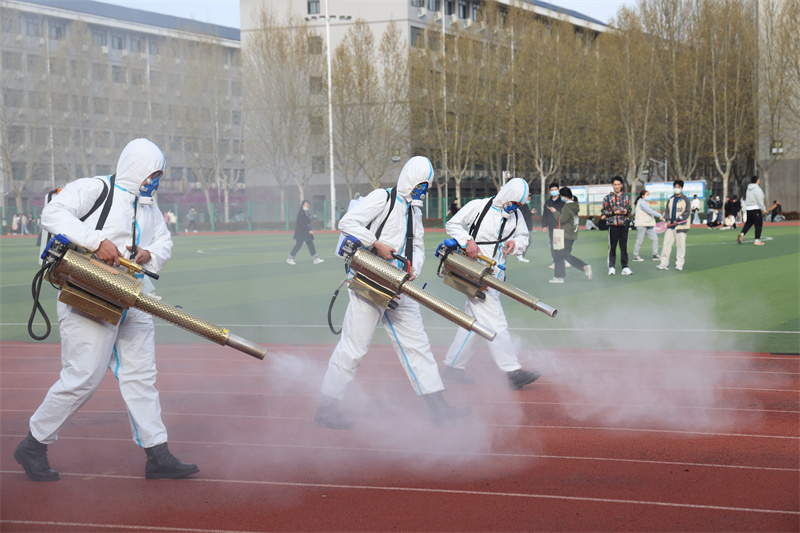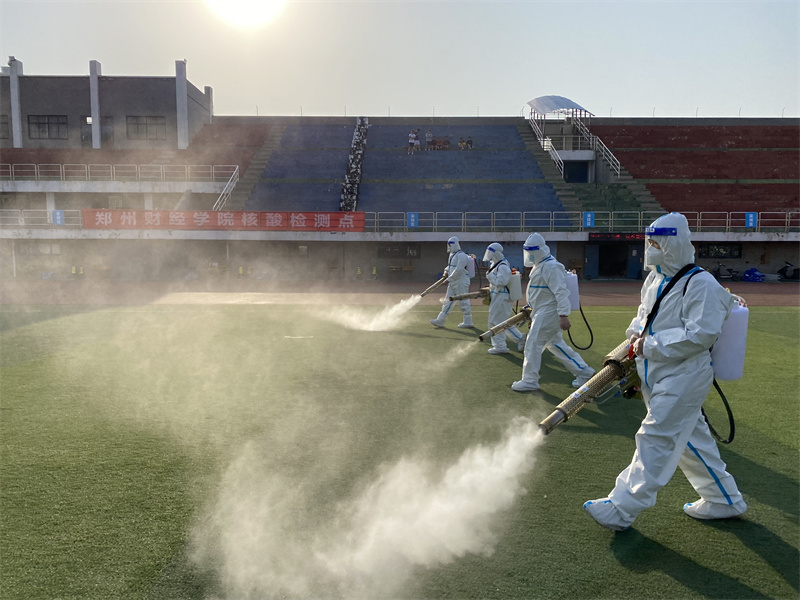 核酸检测结束后,学校工作人员身着防护服,对足球场、文化广场等核酸检测点重点区域进行大面积、全方位、无死角消杀。