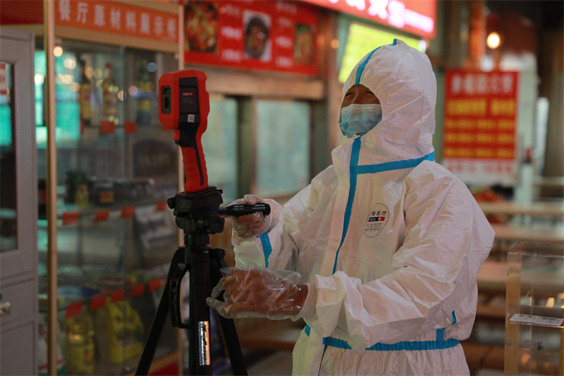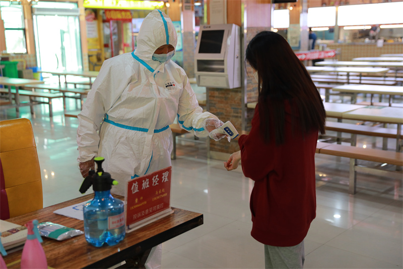 食堂工作人员为学生测量体温