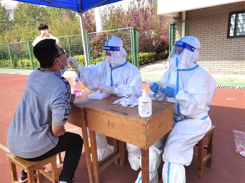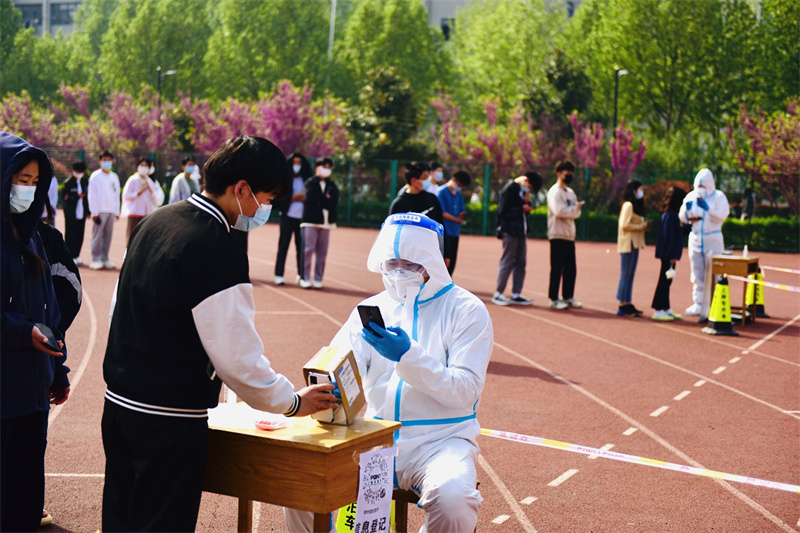 4月8日早上8点半,第一组教工党员防疫志愿者准时在足球场集合,按照规范穿上防护服以后,就立刻投入核酸检测信息采集工作中。中午12点,第二组防疫志愿者早早到岗就位,为下午的核酸检测采集做准备。全员核酸检测现场,化身“大白”的教工党员防疫志愿者操作规范,动作娴熟,确保在校学生顺利完成核酸检测,提升了学校全员核酸检测工作效率。此外,还有一批教工党员志愿者身着红马甲,引导师生保持一米线距离,提醒大家减少交流,维持核酸检测现场秩序。