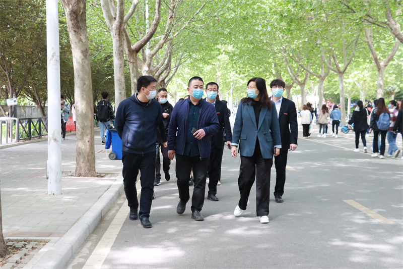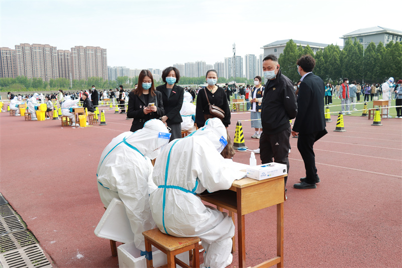 惠济区教育局一行先后来到学校松林广场、文化广场、足球场,实地查看了核酸采样点设置、人员组织、防控措施落实、核酸检测采样进度、核酸检测样本转运点等工作情况。