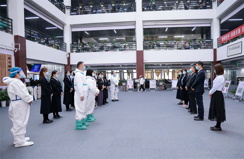 本次应急演练模拟了“学校接到上级疫情防控指挥部门通知,一位次密接同学在图书馆学习,图书馆疫情防控领导小组接到通知后启动疫情防控应急预案”的过程。演练过程中,各工作人员分工明确、协调联动、处置果断有序,既全面检验了图书馆疫情防控应急处置能力,也为图书馆疫情防控工作精准化实施积累了宝贵的经验。