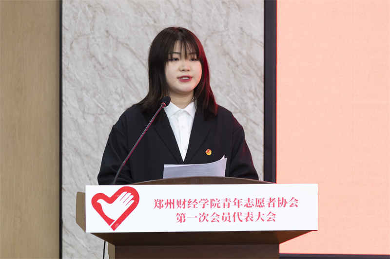 优秀青年志愿者代表张佳琪上台发言,她分别从抗疫志愿工作、红色血脉传承、冬奥志愿服务等方面回顾了过往一年内主要的志愿者服务工作。她表示,身为郑财学子,在接下来的工作中会继续发扬“奉献、有爱、互助、进步”的志愿服务精神,全力做好志愿服务工作,为志愿服务事业的蓬勃发展贡献自己的青春力量。