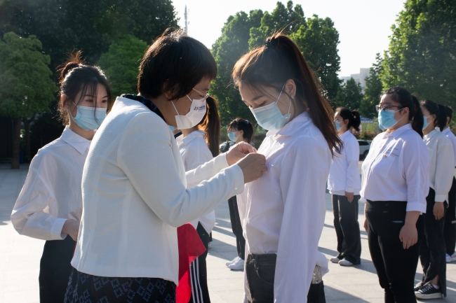 监事会主席李庆阳、副校长陈静和在场教师为新团员佩戴团徽。