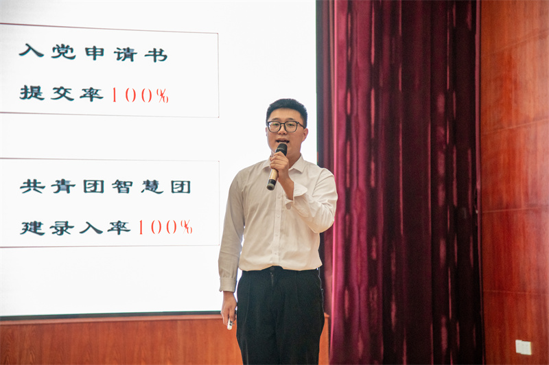 在“活力团支部”风采展示中,外国语学院郭兴润同学以“我们支部,我们的活力”为主题,紧紧围绕支部基本情况、支部思想建设、支部特色活动和支部发展规划四个方面,分享了支部以锐意进取、奋发拼搏的精神书写青年学习、成长、奋斗、奉献的青春故事。