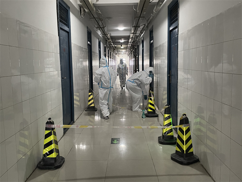 宿舍管理中心工作人员在宿舍门口两侧摆放隔离墩进行封锁