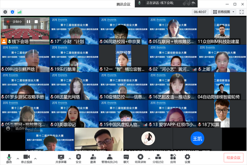 经过资格审查、专家初审等环节,共计有19个项目进入到校级选拔赛,校赛于6月7日线上举行,并邀请上海双钦股权投资基金公司合伙人,中国青年创业导师,清华大学创业导师,河南省大众创业导师张征兵先生,郑州大学商学院兼职教授,河南省大众创业优秀导师,国家农业农村部农业创业百名共享导师,河南纳百川资本创始人董涛先生,融易众创孵化器总经理、郑州市大众创业导师、河南省科技厅创业导师、郑州市人民政府科技创业导师、中国生产力促进创业导师、工信部导师、郑州市人力资源局导师高金梅女士担任评委。