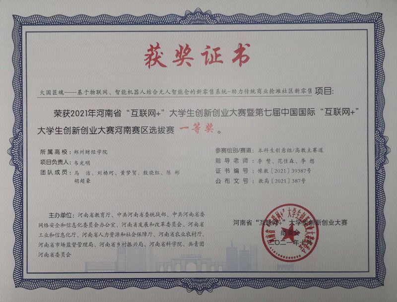 2021年河南省“互联网+”大学生创新创业大赛暨第七届中国国际互联网+”大学生创新创业大赛河南赛区选拔赛一等奖