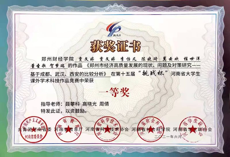 “挑战杯”省赛获奖作品证书