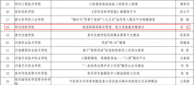 网络资源聚合力。学校不断完善和优化网络育人阵地路径,拓展网络教育平台,打造网络文化品牌,培育网络思政队伍,筑牢清朗网络空间,扎实开展网络育人。近年来,学校构建了校园网络媒体矩阵,整合校内各级各类微信、微博、抖音等新媒体资源,融合发展网络思政教育。学校微信视频号入选全国高校视频号综合影响力榜单,纪录片《疫情无情人间有爱 与祖国同风雨》被评为河南省教育系统新冠肺炎疫情防控工作优秀网络文化作品,微电影《恋砚——黄河情》《人民教师 无上光荣》在郑州市举办的中国梦“微”力量微电影评选活动中分获一等奖与二等奖,新闻作品《春晚郑州分会场上出彩的郑财人》荣获“2020年度河南省高校好新闻奖”新媒体类一等奖。学校还建立了党史学习教育和特色思政等专题网站。