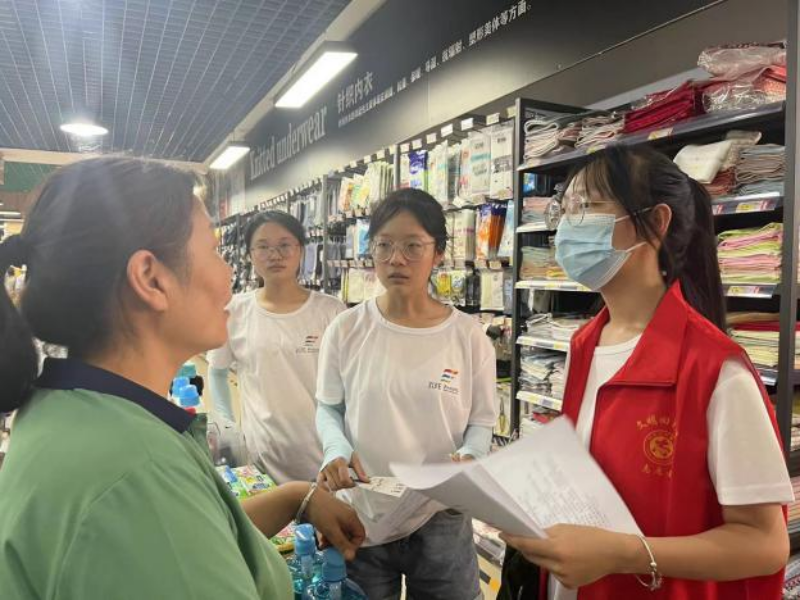“乡约美丽”暑期社会实践调研团成员在回郭镇街道商铺进行问卷调查