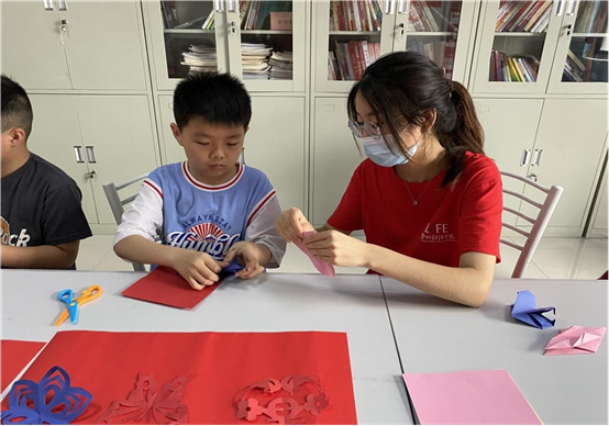 团队成员教小朋友们剪纸
