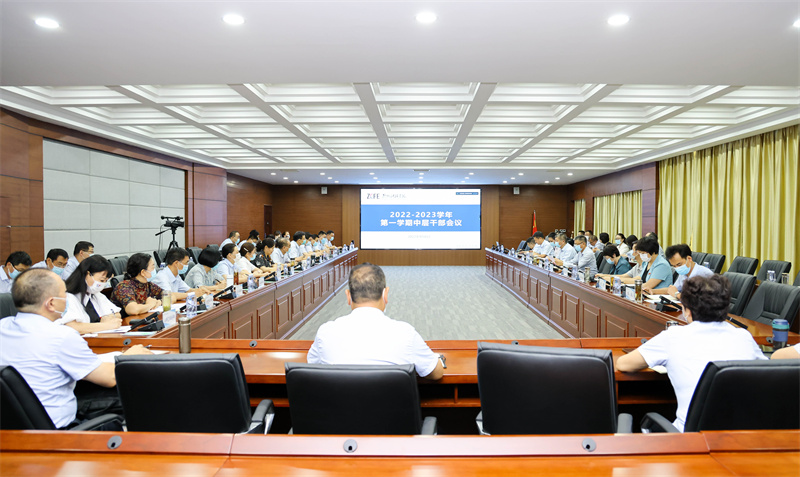 9月8日上午,威廉希尔足球官网召开2022-2023学年第一学期中层干部会议,总结上半年工作并部署安排新学期重点工作。按照疫情防控要求,学校设立两个会场,校党政领导班子成员、全体中层正职干部在德正楼第二会议室参加会议,中层副职干部在德正楼第一学术报告厅通过观看视频直播形式参会。会议由校党委副书记董学力主持。
