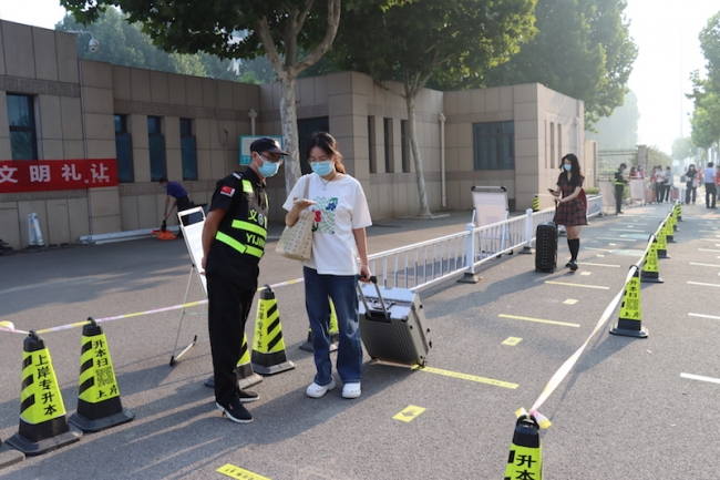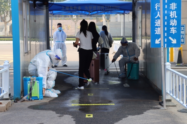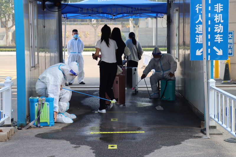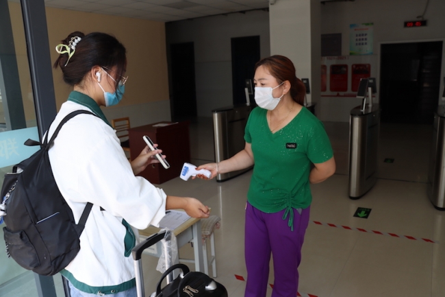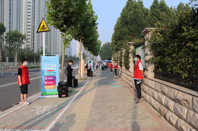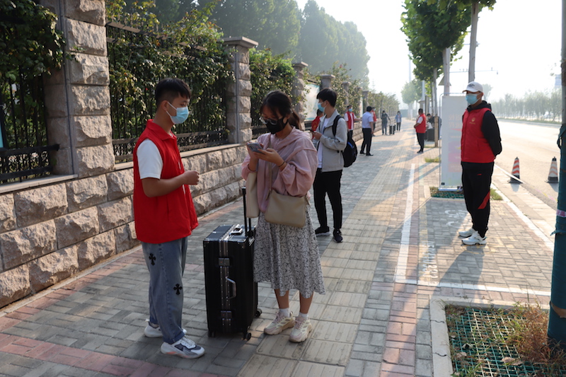 返校当天,学生严格按照“点对点”的要求,“两点一线”从现居地到达学校。入校时,学生需全程佩戴口罩,排队间隔一米行进,在“完美校园APP”中签到确认到校,出示48小时内核酸检测阴性证明,扫描场所码,查看行程卡,对学生及其行李进行消毒杀菌,红外线检测仪监测学生体温情况。因校园疫情防控需要,学生返校时校外无关人员一律不准进校,接送车辆原则上即停即走。
