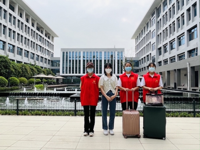 新生到达宿舍楼后,在宿舍门口划定区域内间隔1米距离排队,扫描场所码,再次进行体温测量、行李消杀。核查无误后,经过登记学生方可进入宿舍楼。