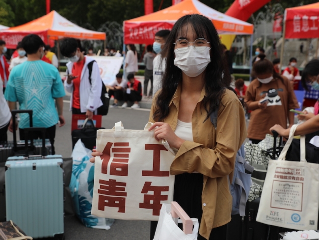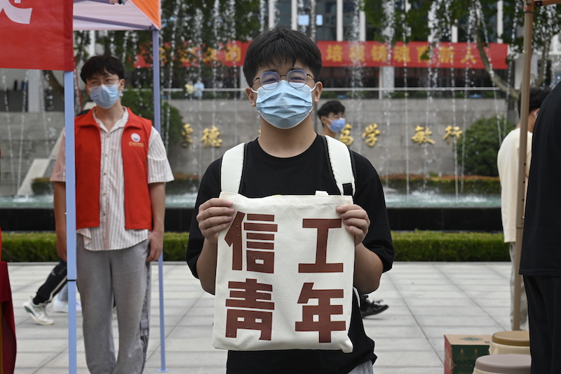 忙碌的报到现场,信息工程学院在为新生发放定制帆布袋。帆布袋整体采用白底红字设计,正面印有“信工青年”四个大字,背面包含校徽、院徽等元素,并印有鲁迅先生的名篇名句。“愿中国青年都摆脱冷气,只是向上走,不必听自暴自弃者流的话……”祝愿各位新生珍惜青春时光,拒绝“躺平”心态,超越自我,书写人生华章。