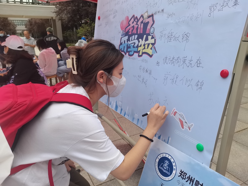 商学院的新生报到处,在迎新工作人员的引导下,新生一边拍照打卡,一边在白板墙上写下自己对大学生活的期许。