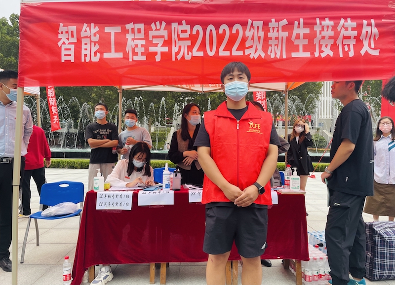 办理完报到手续,放下行李,智能工程学院的新生王邓菠立刻就回到学院迎新帐篷前,当起了志愿者,引导新生报到,帮助新生提拿行李。