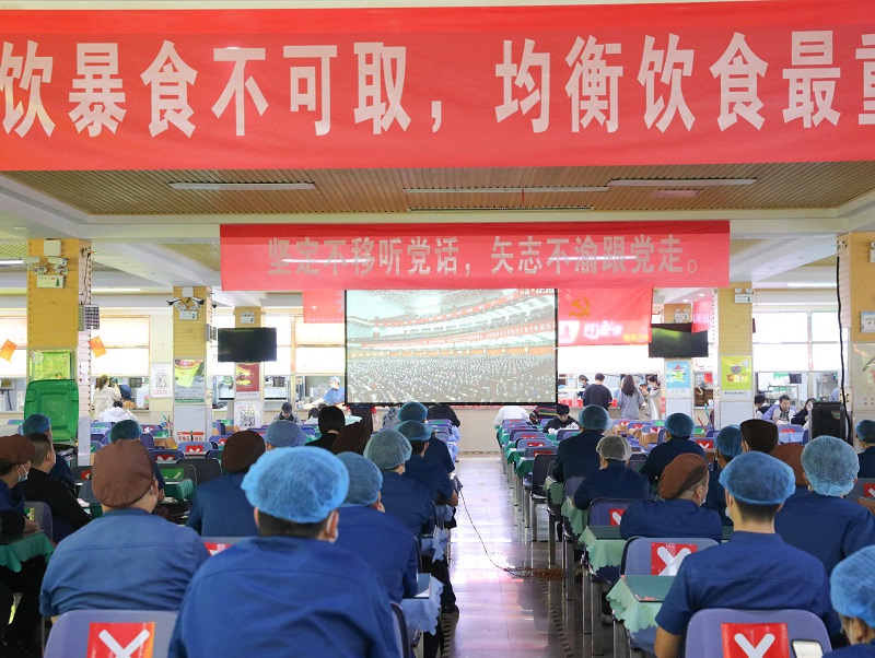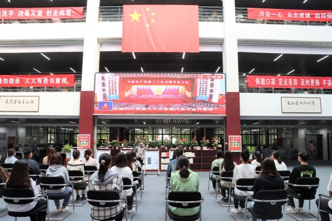 德信楼、图书馆、大学科技园、餐厅等校内所有电子显示屏、电视同步直播大会,广大师生、教职员工认真收听收看大会盛况。