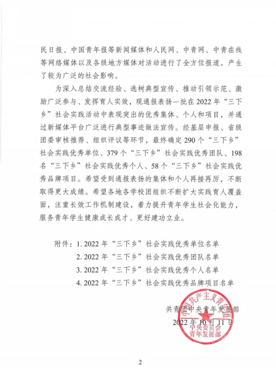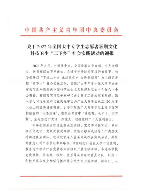 近日,共青团中央青年发展部发布了《关于2022年全国大中专学生志愿者暑期文化科技卫生“三下乡”社会实践活动的通报》。经校团委基层推报、团省委审核推荐、团中央组织评议等环节,威廉希尔官网“小绿伞”防溺水暑期社会实践团从全国25万多支实践队伍中脱颖而出,获评2022年全国大中专学生志愿者暑期“三下乡”社会实践优秀团队。