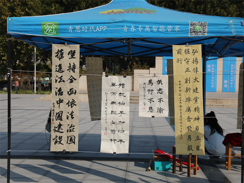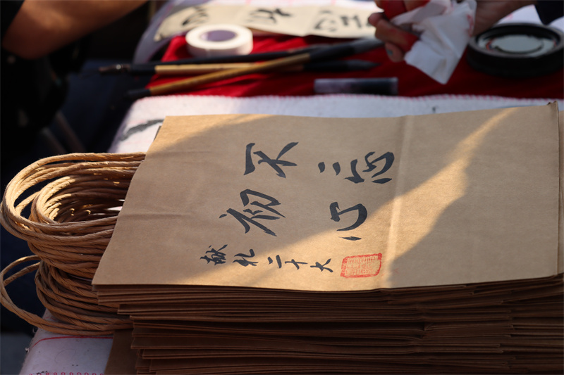 笔会活动还组织了书法文创作品赠送,将党的二十大报告中金句金词书写在书法纸袋上赠送给现场学生。同学们对这种文化与思想高度融合的文创艺术作品热情满满,广场上排出几列长队。活动现场翰墨灵动、热烈欢快。参与活动的同学们纷纷表示,既学习了党的二十大会议精神,又感受了传统文化的艺术魅力,收获颇丰。