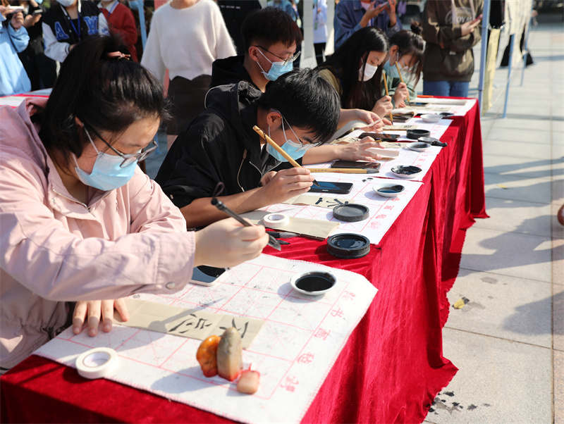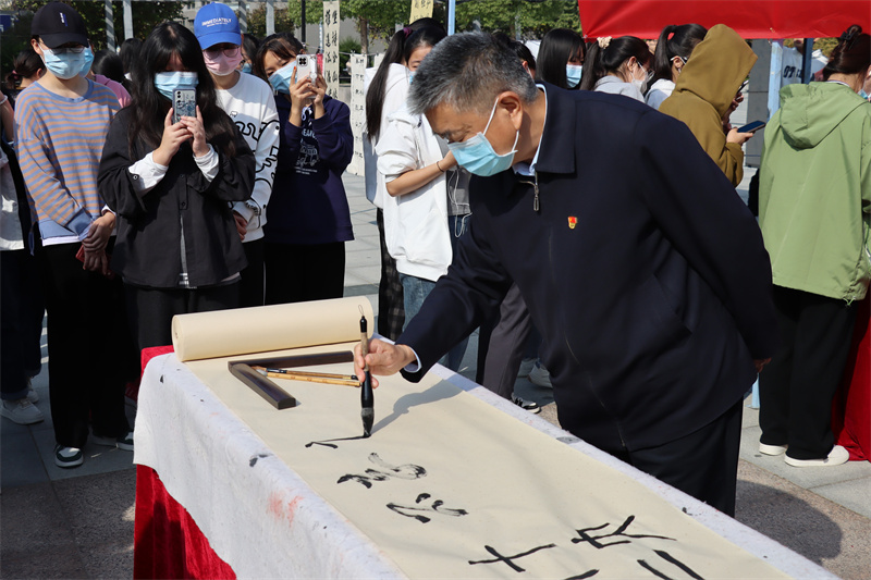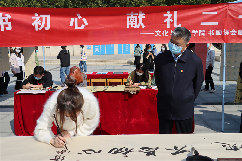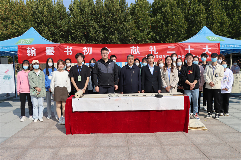 为营造全面学习宣传贯彻党的二十大精神的浓厚氛围,引领广大青年学子学习、践行党的二十大精神,10月22日上午,威廉希尔官网文化与传媒学院党总支联合书画协会在学校文化广场举办了庆祝党的二十大胜利召开书法笔会,向党的二十大献礼。校党委书记李国强出席笔会活动,文化与传媒学院领导班子及数百名郑财学子参加活动。