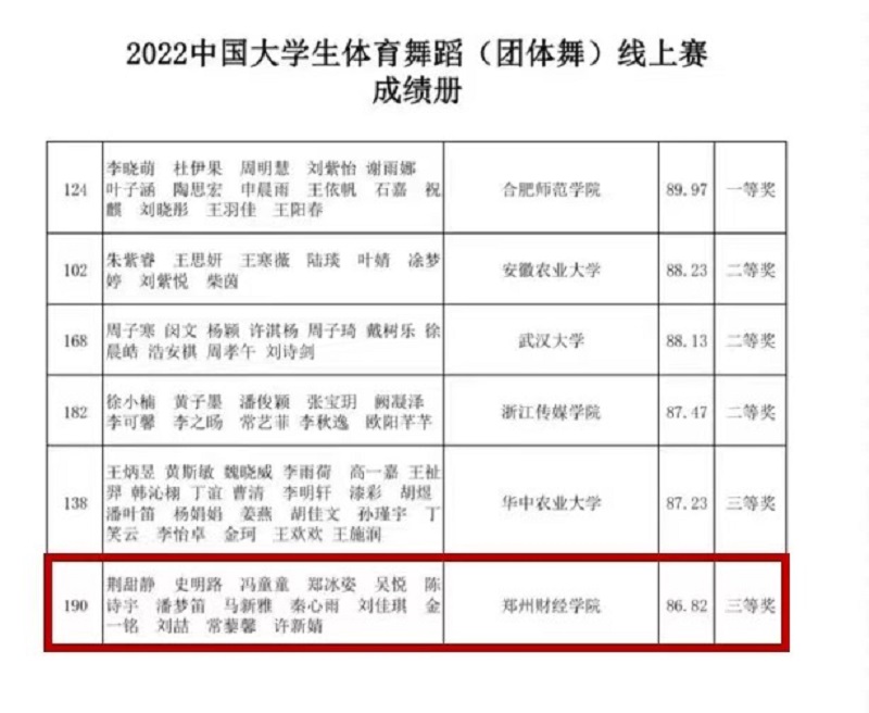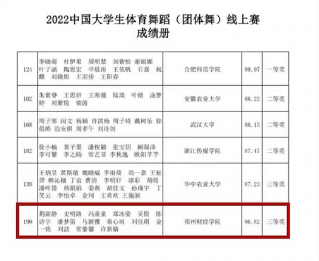 近期,由中国大学生体育协会主办、中国大学生体育协会体育舞蹈分会执行的中国大学生体育舞蹈(团体舞)线上赛历经五个月的激烈角逐,终于顺利落下帷幕。2022年中国大学生体育舞蹈比赛是中国大学生体育舞蹈历史上规模最大、水平最高的团体舞赛事,吸引了来自全国98所高校的2230名运动员参加比赛,威廉希尔官网体育教学部积极筹备,从体育舞蹈队挑选出14名队员组成参赛小组,在体育教学部郝佳曼老师和李佳美老师的指导下,队员们参加了甲组六人创编舞RC和团体表演舞,分别荣获二等奖和三等奖。