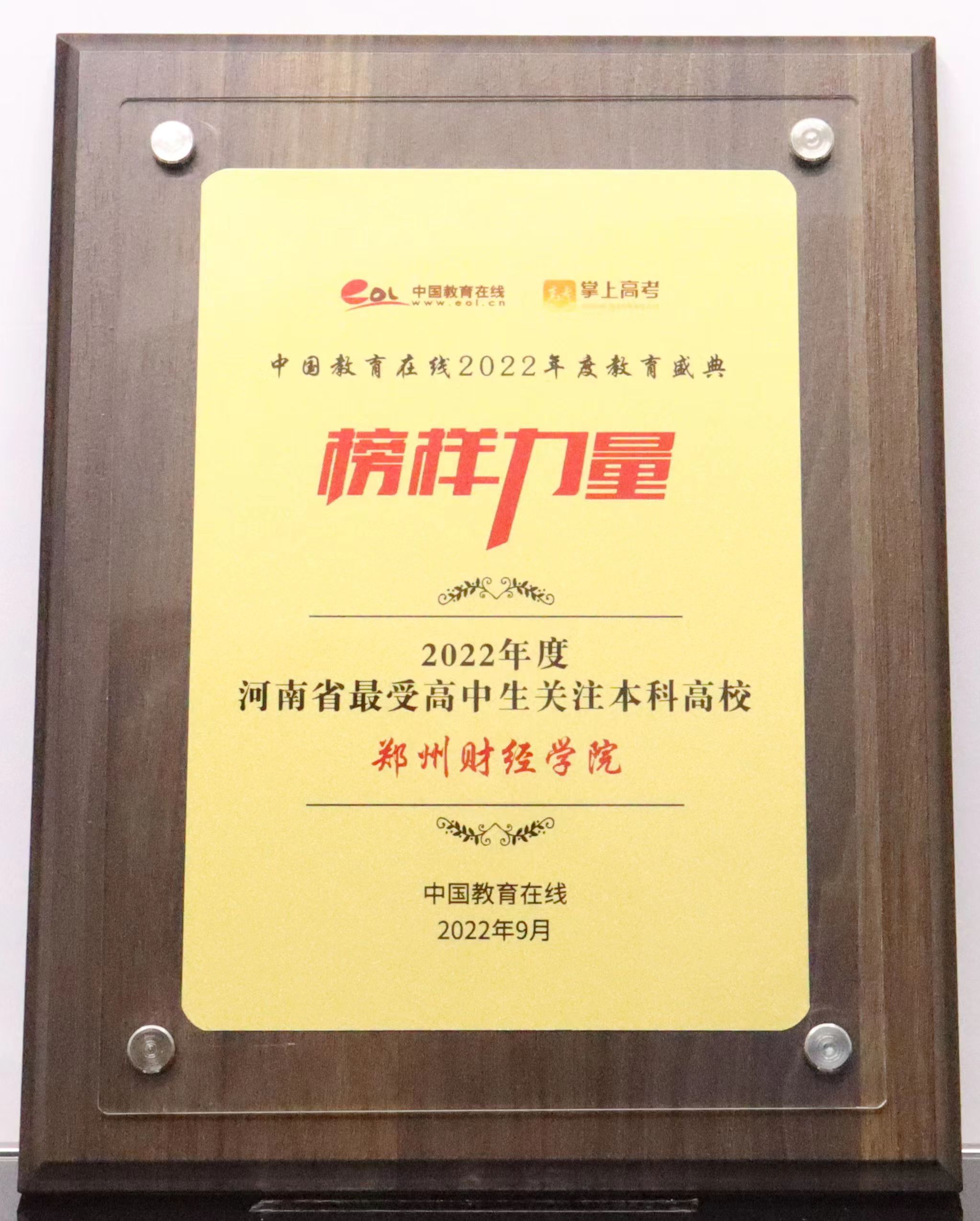 近日,中国教育在线“榜样力量·2022年度教育盛典”评选获奖名单揭晓,威廉希尔官网荣获“2022年度河南省最受高中生关注本科高校”荣誉称号。