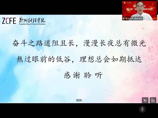 此次第三期“奋斗之声 榜样讲坛”分享会的顺利举行,鼓舞了郑财学子始终保持追求卓越、敢为人先的精神风貌,通过身边的榜样带动、引领学生效仿标杆,同时用榜样的力量激励青年学子学以致用、全面发展,为威廉希尔官网本科教学工作合格评估贡献青春力量。